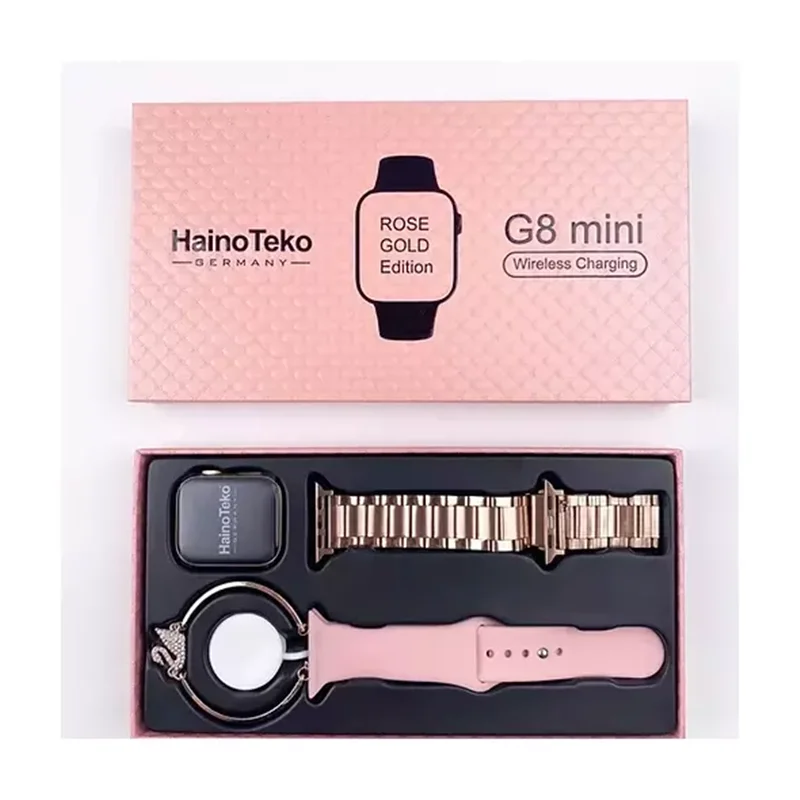 یک ساعت با دو رنگ طلایی و رزگلد می تواند به عنوان ساعتی بی نظیر برای افرادی باشد که دنبال افزایش جذابیت تیپ و استایل خود هستند. دو بند در پک بسته بندی ساعت هوشمند هاینو تکو g8 mini قرار دارد که می توانید هریک را دوست دارید، به ساعت خود متصل نمایید. هاینو تکو در نظر گرفته است برای افرادی که قصد خرید این ساعت را دارند، یک هدیه داشته باشد.