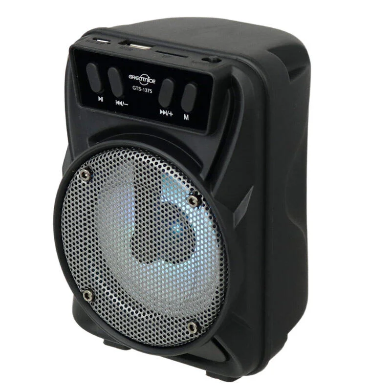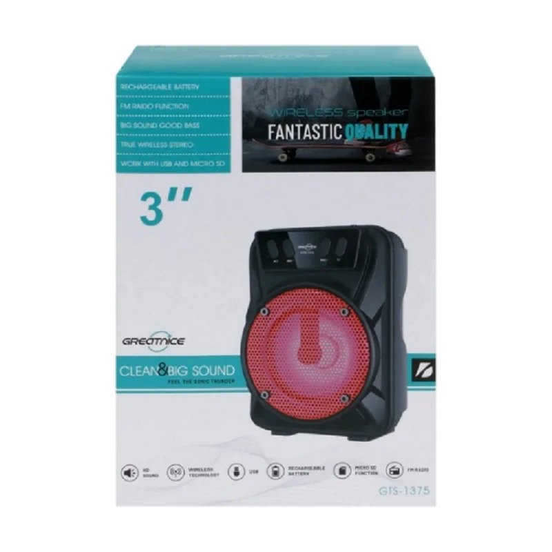کمپانی گریت نایس یکی از کمپانی های شناخته شده در عرصه تولید انواع اسپیکرهای با کیفیت با قیمت مناسب می باشد. اسپیکر گریت نایس مدل GTS-1375 یکی از از اسپیکرهای با اندازه کوچک که دارای کیفیت مناسب با توجه به اندازه آن می باشد. یکی از مزیت های اسپیکرهای تولیدی این کمپانی قیمت بسیار مناسب تولیدات آن در مقایسه با کمپانی های دیگر سازنده اسپیکر می باشد. اسپیکر گریت نایس مدل GTS-1375 نیز از همین دسته از کالاهای تولیدی این کمپانی می باشد. این اسپیکر از نوع اسپیکرهای قابل حمل می باشد که دارای باتری لیتیومی قابل شارژ است که از طریق کابل همراه آن و اتصال به شارژرهای معمولی گوشی های تلفن همراه که خروجی 5 ولت دارند قابل شارژ شدن است. یکی از ویژگی های جالب این اسپیکر رقص نور جذاب آن هنگام پخش موسیقی است